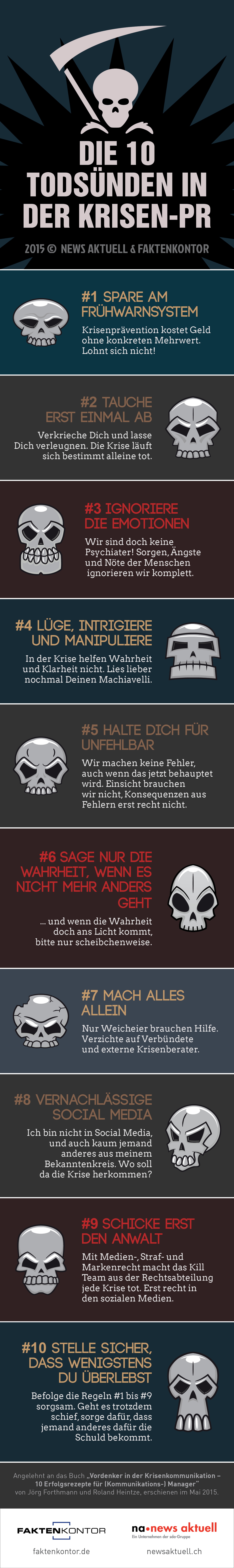 Die zehn grössten Fehler im Detail: 1. Spare am Frühwarnsystem Krisenprävention kostet Geld ohne konkreten Mehrwert. Lohnt sich nicht! 2. Tauche erst einmal ab Verkrieche Dich und lasse Dich verleugnen. Die Krise läuft sich bestimmt alleine tot. 3. Ignoriere die Emotionen Wir sind doch keine Psychiater! Sorgen, Ängste und Nöte der Menschen ignorieren wir komplett. 4. Lüge, intrigiere und manipuliere In der Krise helfen Wahrheit und Klarheit nicht. Lies lieber nochmal Deinen Machiavelli. 5. Halte Dich für unfehlbar Wir machen keine Fehler, auch wenn das jetzt behauptet wird. Einsicht brauchen wir nicht, Konsequenzen aus Fehlern erst recht nicht. 6. Sage nur die Wahrheit, wenn es nicht mehr anders geht ...und wenn die Wahrheit doch ans Licht kommt, bitte nur scheibchenweise. 7. Mach' alles allein Nur Weicheier brauchen Hilfe. Verzichte auf Verbündete und externe Krisenberater. 8. Vernachlässige Social Media Ich bin nicht in Social Media, und auch kaum jemand anderes aus meinem Bekanntenkreis. Wo soll da die Krise herkommen? 9. Schicke erst den Anwalt Mit Medien-, Straf- und Markenrecht macht das Kill Team aus der Rechtsabteilung jede Krise tot. Erst recht in den sozialen Medien. 10. Stelle sicher, dass wenigstens Du überlebst Befolge die Regeln #1 bis #9 sorgsam. Geht es trotzdem schief, sorge dafür, dass jemand anderes dafür die Schuld bekommt.
