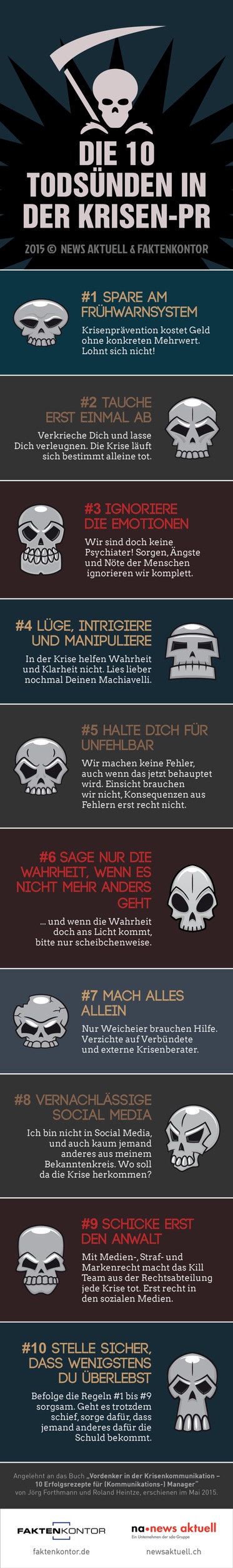 Zürich (ots) - Am Frühwarnsystem sparen, den Kopf in den Sand stecken und nicht auf die Ängste der Menschen eingehen - diese und andere Fehler sollten Kommunikationsmanager unbedingt vermeiden, wenn ihr Unternehmen in eine Krisensituation gerät. Die sda-Tochter news aktuell (Schweiz) AG und Faktenkontor haben in einer Infografik die zehn grössten Todsünden in der Krisen-PR zusammengestellt.