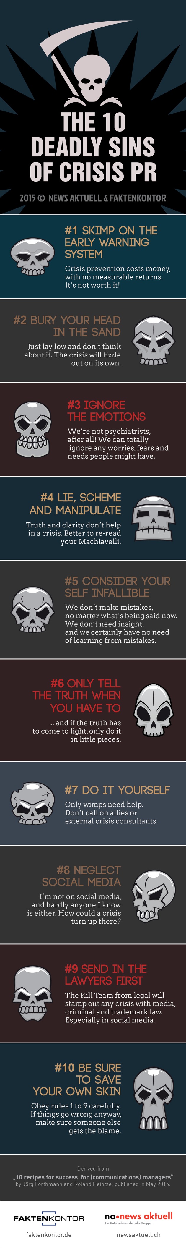 Saving money on an early-warning system, sticking their heads in the sand and not listening to people's fears - these and other mistakes should definitely be avoided by communication managers when their company gets into a crisis situation. sda subsidiary news aktuell and Faktenkontor have compiled a chart showing the ten greatest deadly sins in crisis PR.