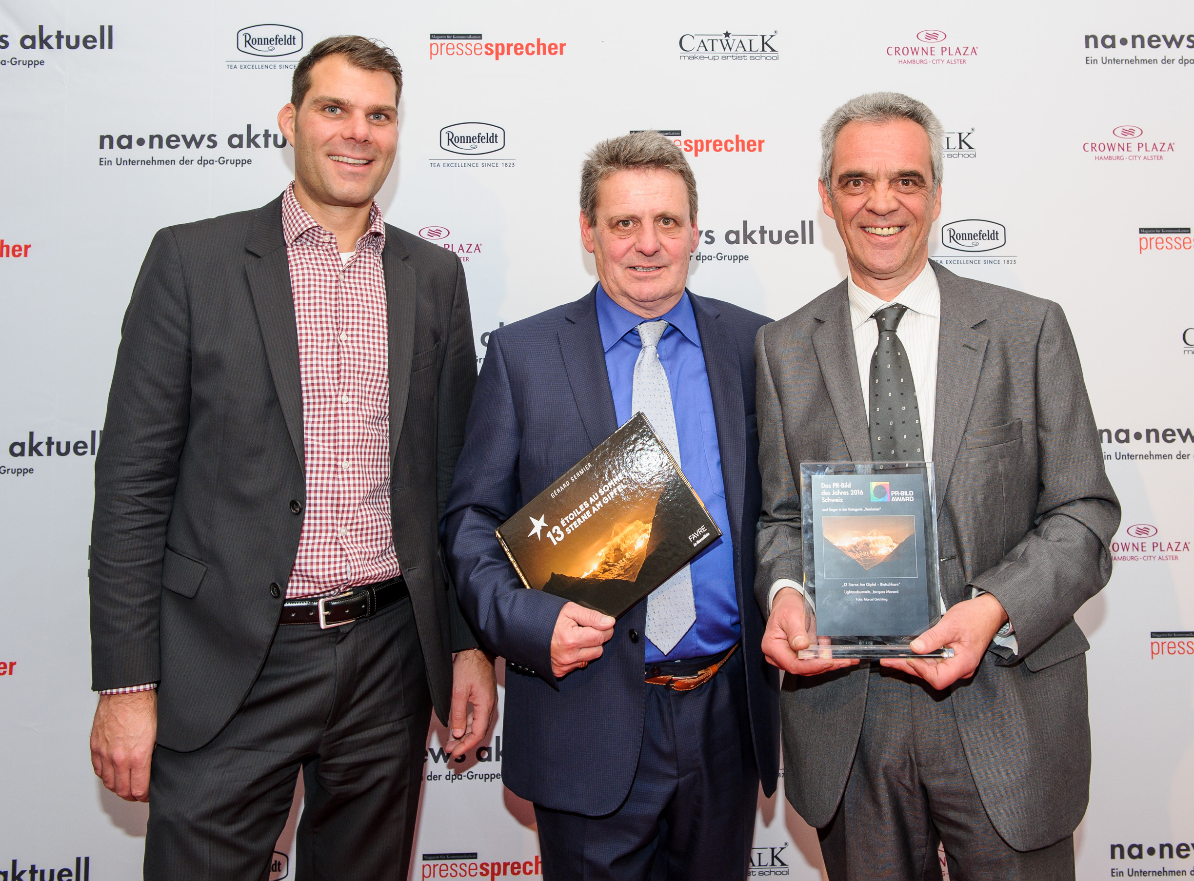 Projektinitiator Jacques Morard und Sprecher Gérard Sermier von Lightandsummits nahmen den Preis vor 300 geladenen Gästen im Internationalen Maritimen Museum Hamburg entgegen. Das Foto mit dem vollständigen Titel "13 Sterne am Gipfel - Bietschhorn" überzeugte Jury und Öffentlichkeit gleichermassen und erreichte in der Kategorie Tourismus und Freizeit das beste Gesamturteil. Fotografiert wurde das Bild von Marcel Grichting.
