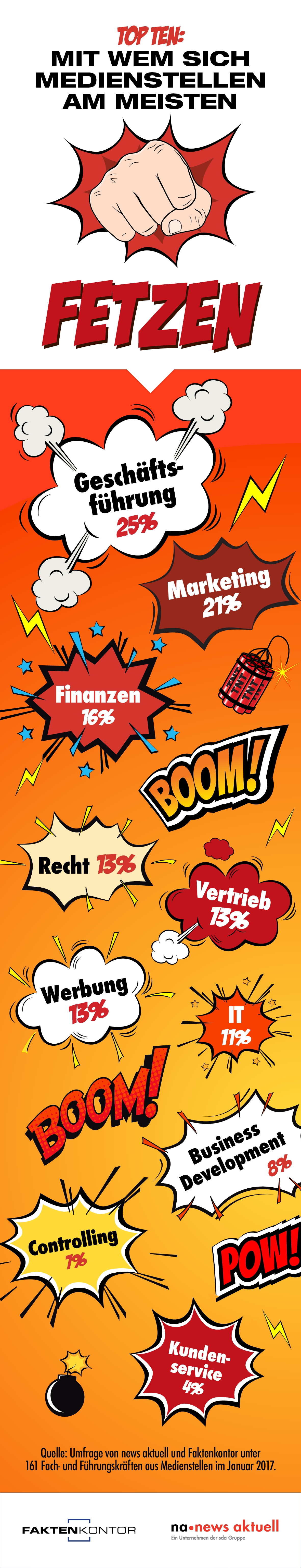 Die meisten Dispute führen Mediensprecher mit der Geschäftsführung. Nur wenig seltener Knatsch gibt es mit den Kolleginnen und Kollegen aus dem Marketing. Auf Platz drei der internen Konflikt-Partner landet die Finanzabteilung. Das ergab eine Umfrage von news aktuell und Faktenkontor. Die sda-Tochter hat bei Fach- und Führungskräften der PR nachgefragt, mit welchen Abteilungen sie die meisten Auseinandersetzungen haben. Über 160 Kommunikationsprofis haben am PR-Trendmonitor teilgenommen.