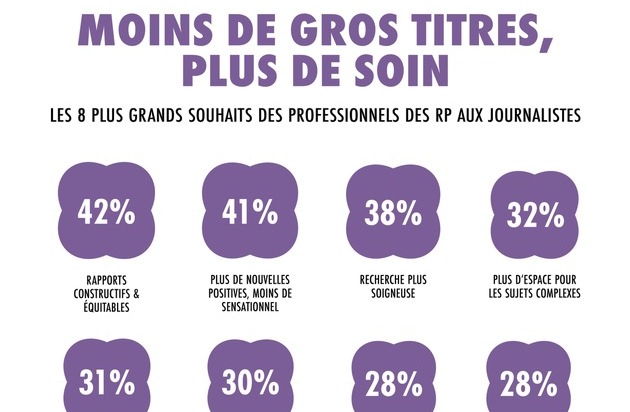Les professionnels de la communication placent une couverture médiatique constructive et équitable en tête de liste de leurs souhaits. 42 % des professionnels et cadres des RP interrogés citent cet aspect comme leur principale demande aux rédactions. Elle est suivie de près, avec 41 %, par le souhait d'avoir plus de nouvelles positives et moins de sensationnalisme. Pour 38 % des personnes interrogées, une recherche plus approfondie est particulièrement importante.