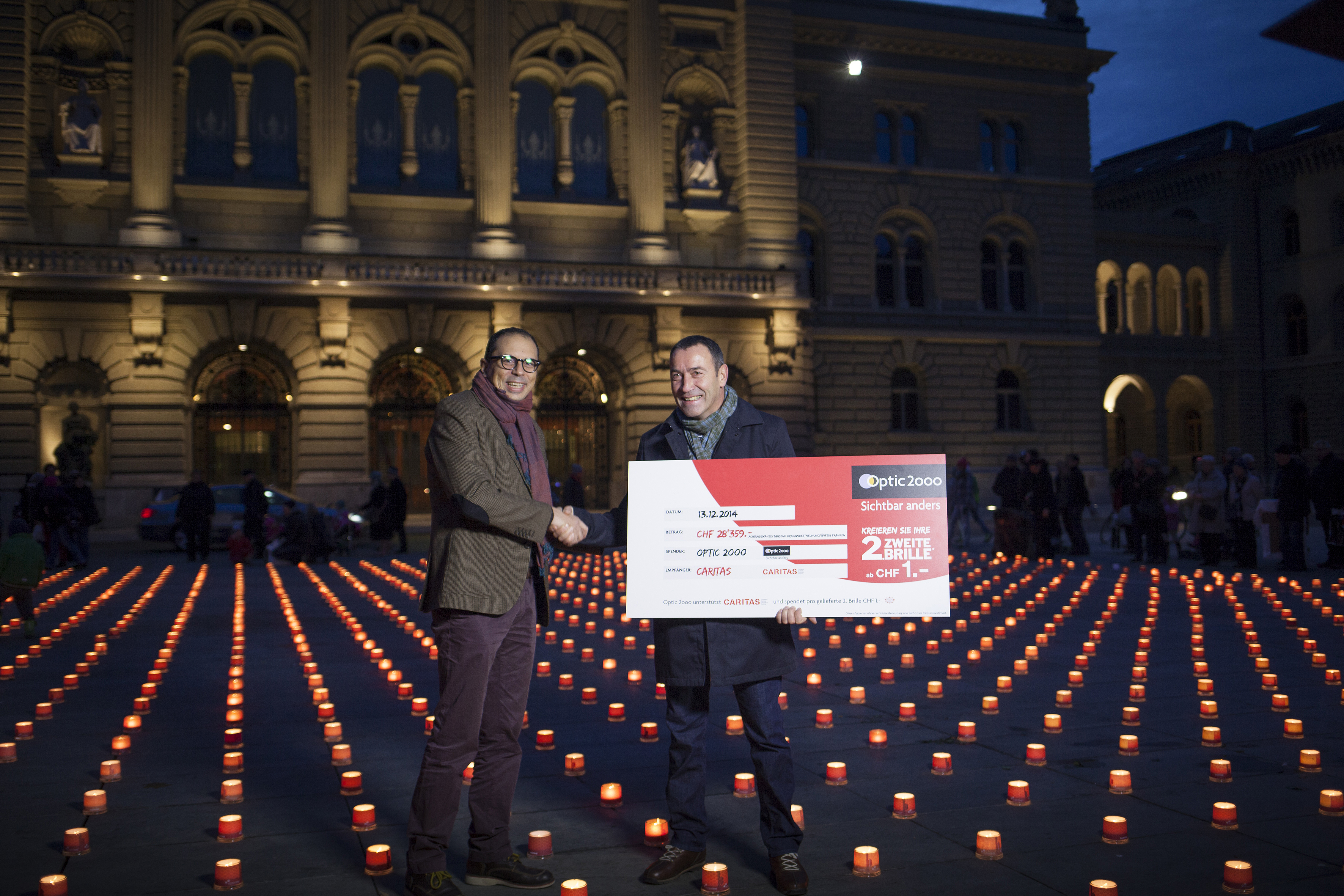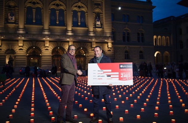 "Armut in der reichen Schweiz ist stossend. Es ist uns mit unserem Engagement für Caritas ein grosses Anliegen, hier einen wirksamen Beitrag zu leisten." Dies sagte Imad El Mekhtoum, Geschäftsleiter von Optic 2000 Schweiz bei der Überreichung eines Spendencheques über fast 30 000 Franken an Bruno Bertschy von Caritas Schweiz. Die Übergabe fand am 13. Dezember auf dem Bundesplatz in Bern im Rahmen der Caritas-Aktion Eine Million Sterne statt, die ein Zeichen für eine solidarische Schweiz setzt.