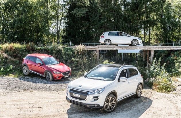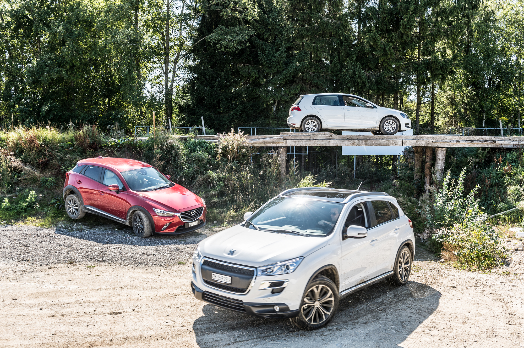 La Peugeot ha convinto per l'alto baricentro e la trasmissione integrale regolabile, due qualità apprezzate in particolare sul terreno. Con un baricentro più basso e dotata di pneumatici sportivi, Mazda più agevole su strada asfaltata e ha ottenuto il miglior risultato nel "test dell'alce", aspetto da sottolineare in particolare nel confronto con la VW Golf. Tuttavia, la trazione integrale può influire negativamente sullo spazio sfruttabile del portabagagli e sui consumi, rispetto a una vettura a due ruote motrici. Nelle prove di trazione, la VW Golf ha sorpreso, poiché è riuscita a trainare il rimorchio più pesante tra i tre veicoli sottoposti al test.