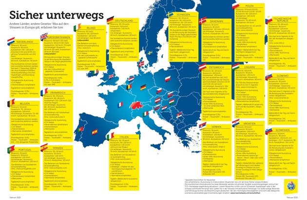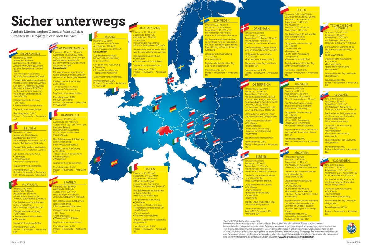 In diesem Sommer werden wieder viele Ferienreisende die Schweiz mit dem Auto verlassen und eine oder mehrere Grenzen überqueren. Jedes Land verfügt jedoch über eigene Regeln für den Verkehr, insbesondere in Bezug auf die Sicherheitsausstattung und Maut. Bei Nichteinhaltung können sich die Bussen schnell summieren. Für eine optimale Vorbereitungen steht auf der Website des TCS eine Übersichtskarte mit den wichtigsten Vorschriften in Europa zur Verfügung.