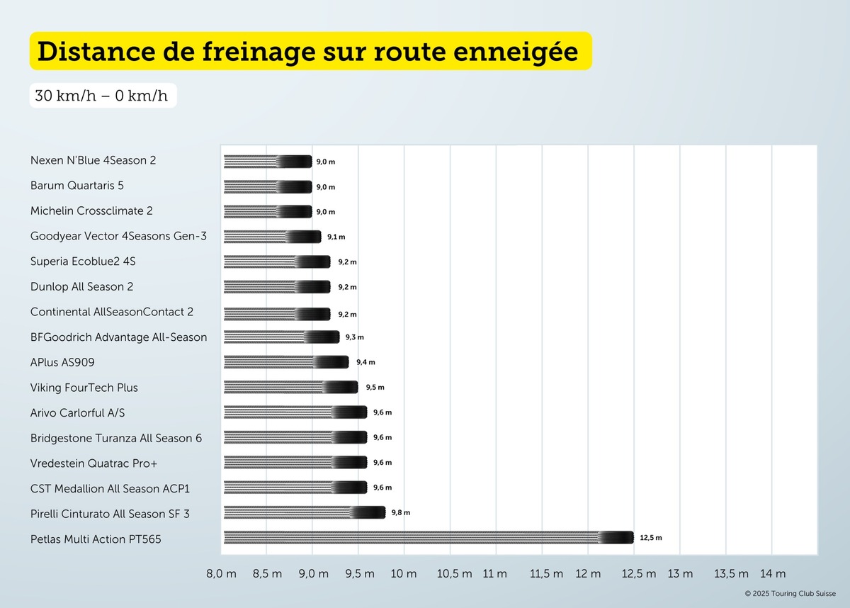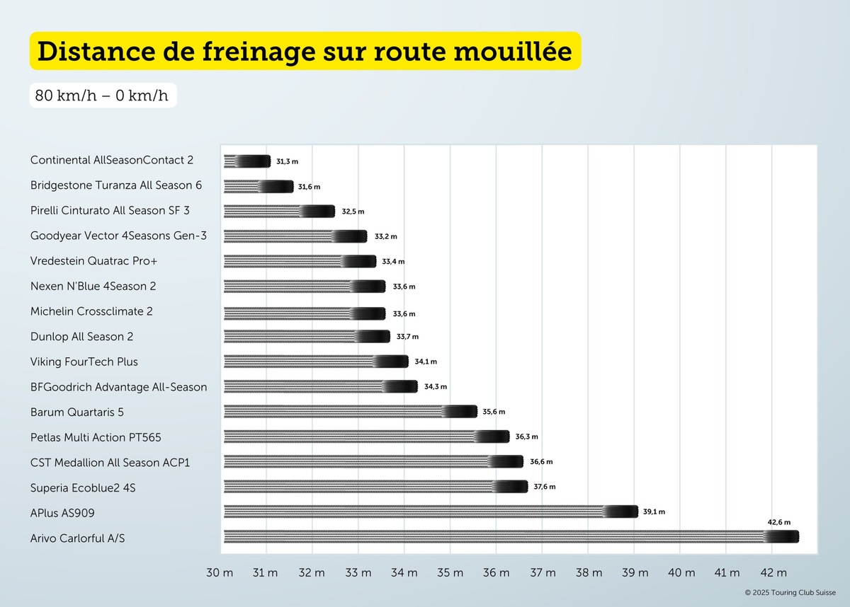 Sur chaussée mouillée, à 80 km/h, les meilleurs résultats au test de freinage sont obtenus avec les Continental All Season Contact 2, tandis que les moins bons proviennent des Arivo Carlorful A/S. L'écart de distance d'arrêt atteint 11,3 mètres : lorsque la voiture équipée des Continental est arrêtée, celle munie des Arivo affiche une vitesse résiduelle proche de 41 km/h, ce qui augmente considérablement le risque d'accident. Sur route enneigée à 30 km/h, les pneus les plus performants sont les Nexen N'Blue 4 Season 2, tandis que les moins efficaces sont les Petlas Multiaction PT565 avec une distance de freinage de 3,5 mètres supplémentaires. Cela correspond à une vitesse résiduelle de 16 km/h - un écart significatif en matière de sécurité.