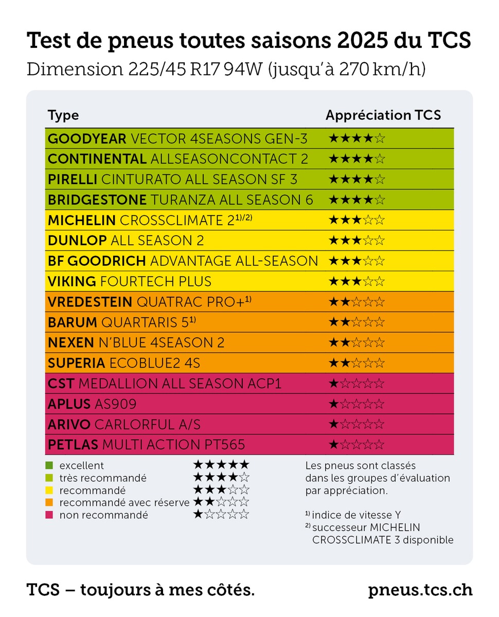 Les pneus toutes saisons gagnent en popularité, surtout en milieu urbain où la neige est rare. Leur promesse est d'offrir une polyvalence tout au long de l'année, avec une bonne adhérence sur routes sèches, mouillées ou enneigées, évitant ainsi de changer de pneus à chaque saison. Pour être vraiment efficaces, ils doivent se rapprocher des performances des pneus spécialisés, été comme hiver. Le test du TCS portant sur 16 modèles disponibles sur le marché révèle de fortes disparités : quatre modèles de pneus sont "hautement recommandés", quatre "recommandés", quatre "recommandés sous condition" et quatre "non recommandés".