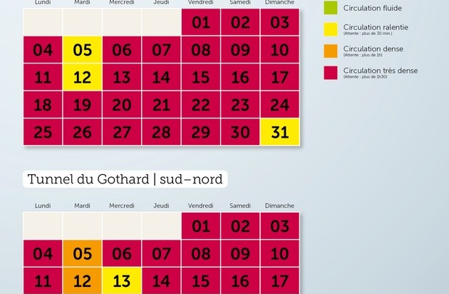 L'année dernière, plus de 10 kilomètres d'embouteillages ont été comptabilisés au portail sud pendant trois week-ends d'août. Cette année encore, il est réaliste de miser sur un volume de trafic similaire. Les temps d'attente les plus longs sont attendus du jeudi au lundi. Pour traverser le Saint-Gothard sans embouteillages, il est préférable de rentrer le mardi. Il est également recommandé de traverser le tunnel tôt le matin ou tard le soir.