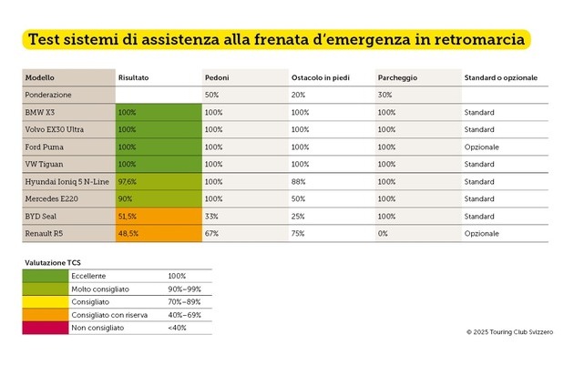 I sistemi di assistenza per il parcheggio e le manovre di retromarcia aiutano a evitare gravi incidenti e danni materiali, avvertendo chi è alla guida o effettuando una frenata d'emergenza. Il TCS ha testato i sistemi di assistenza alla frenata d'emergenza per la retromarcia di otto modelli di veicoli, constatando che il prezzo del veicolo non incide sulla qualità e che tutti i sistemi testati superano i requisiti minimi di legge.