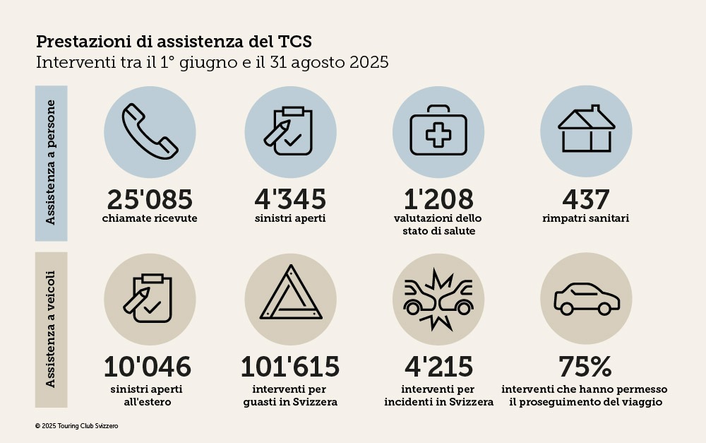 Quella del 2025 è stata un'estate intensa per il TCS, con una forte attività in tutto il territorio svizzero e all'estero. La centrale di assistenza ha ricevuto oltre 233'000 chiamate per richieste di aiuto, mentre la pattuglia del TCS ha effettuato 101'615 interventi tra l'inizio di giugno e la fine di agosto. A livello internazionale, il TCS ha assistito i suoi soci in 15'046 interventi, di cui 10'006 di soccorso stradale. I medici del TCS hanno effettuato oltre 1'200 perizie mediche e organizzato 437 rimpatri sanitari.