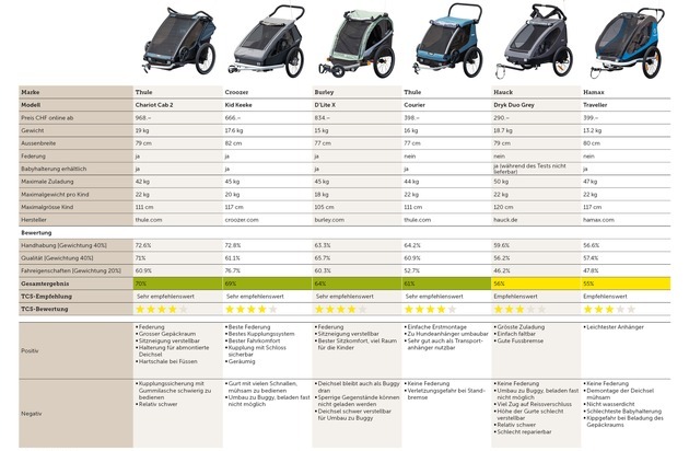 Der TCS hat sechs viel verkaufte Velokinderanhänger unterschiedlicher Preisklassen getestet. Alle Modelle erfüllen grundsätzlich ihren Zweck, doch keiner überzeugt in sämtlichen Testkriterien. Günstigere Anhänger bleiben nutzbar, erfordern jedoch Kompromisse bei Komfort und Sicherheit. Eine Federung vermindert die Gefahr des Kippens beim Überfahren eines Hindernisses. Auch die Platzierung der Kinder im Anhänger hat einen Einfluss auf deren Sicherheit.