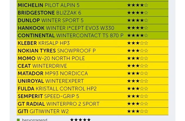 Schliesslich sind sechs Reifen "sehr empfehlenswert", sämtlich aus der Premium-Kategorie. Die drei besten Reifen im Test sind Goodyear UltraGrip Performance 3, Michelin Pilot Alpin 5 und Bridgestone Blizzak 6.