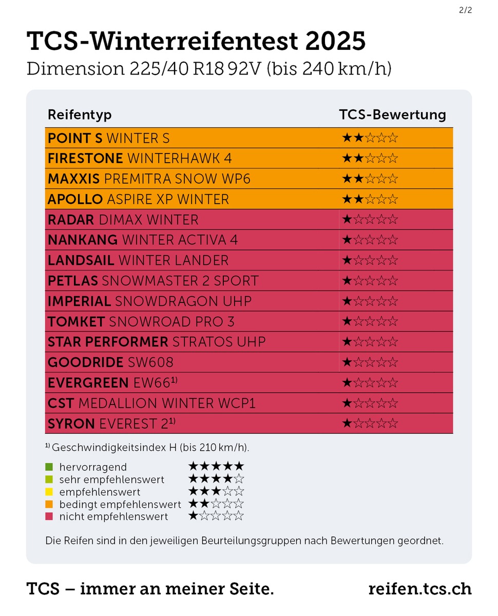 Mit dem Einbruch der kalten Jahreszeit ist es Zeit, das Fahrzeug mit Winterreifen auszurüsten. Um die Automobilistinnen und Automobilisten bei der Wahl zu unterstützen, hat der Touring Club Schweiz 31 Winterreifen der Grösse 225/40 R18 92V getestet. Mehr als ein Drittel der geprüften Reifen hat die Tests nicht bestanden und gilt als nicht empfehlenswert. Alle nicht empfohlenen Modelle sind die günstigsten im Test. Auf nasser Fahrbahn können die Bremswege der schwächsten Modelle um mehr als 15 Meter länger ausfallen - ein potenziell tödliches Risiko.