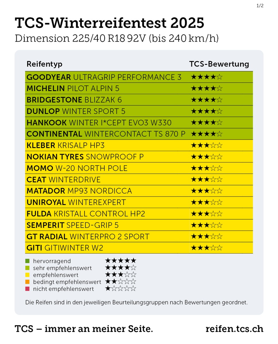 Winterreifen sind speziell für Schnee, Glatteis und tiefe Temperaturen konzipiert. Sie sorgen für gute Traktion und kürzere Bremswege und tragen damit wesentlich zur Sicherheit aller Verkehrsteilnehmenden auf winterlichen Strassen bei. In diesem Jahr hat die Abteilung Test & Technik des Touring Club Schweiz 31 Winterreifen in der Dimension 225/40 R18 92V bewertet. Die Produkte wurden nach 19 Testkriterien beurteilt, zusammengefasst in zwei Hauptkategorien: "Fahrsicherheit" und "Umweltbilanz".