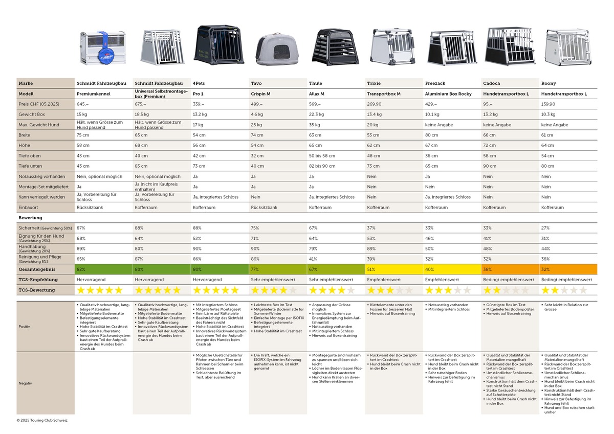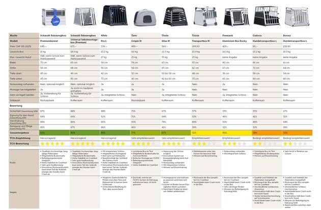 Eine sichere Hundebox schützt nicht nur das Tier, sondern auch die Fahrzeuginsassen. Der Hundeboxentest des TCS weist deutliche Qualitätsunterschiede zwischen den getesteten Modellen auf, insbesondere beim Kriterium Sicherheit.