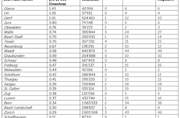 Direkt hinter Genf folgen Jura (0,80), Obwalden (0,76), Wallis (0,74), Basel-Stadt (0,70), Tessin (0,70), Neuenburg (0,67) und Waadt (0,58). Im Vergleich zu 2023 stieg dieser Anteil in den Kantonen Jura (0,27), Obwalden (0,26), Wallis (0,62), Basel-Stadt (0,66) und Neuenburg (0,57), während er im Tessin (0,73 im Jahr 2023) und im Kanton Waadt (0,64) zurückging.