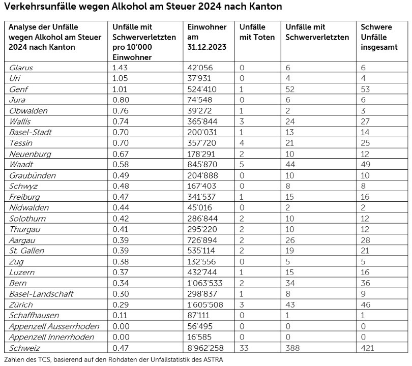 Im Jahr 2024 verzeichnete der Kanton Glarus den höchsten Anteil schwerer alkoholbedingter Unfälle mit 1,43 Unfällen pro 10'000 Einwohner, gegenüber 0,48 im Vorjahr. Uri folgt mit 1,05 schweren Unfällen pro 10'000 Einwohner, ein Anstieg gegenüber 0,54 im Jahr 2023. Diese Veränderungen lassen sich insbesondere durch die geringe Bevölkerungszahl in diesen Kantonen erklären, bei der ein zusätzlicher Unfall die Statistik stark beeinflusst.