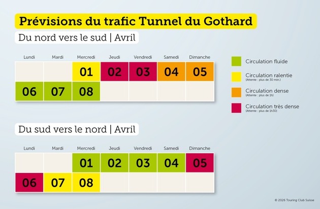 Les voyageurs qui partent vers le sud avant le Jeudi saint doivent s'attendre à un temps d'attente maximal d'une heure au Gothard. Le Jeudi saint, le trafic devrait fortement augmenter et, surtout après midi, des temps d'attente de plus de deux heures sont à prévoir. Hormis une courte accalmie durant la nuit de jeudi à vendredi, les embouteillages devraient se poursuivre jusqu'au soir du Vendredi saint. Après le Gothard, les voyageurs doivent également prévoir suffisamment de temps au poste-frontière de Chiasso-Brogeda. Le trafic de retour commencera vraisemblablement dès le dimanche de Pâques. À partir de midi, il faudra prévoir des temps d'attente d'environ 1,5 heure au portail sud du Gothard. Le lundi de Pâques, le trafic augmentera continuellement dès 9 heures et, dans l'après-midi jusqu'en soirée, les pertes de temps pourront atteindre 3 heures. Au cours de la semaine, des embouteillages sont également attendus l'après-midi et en début de soirée.