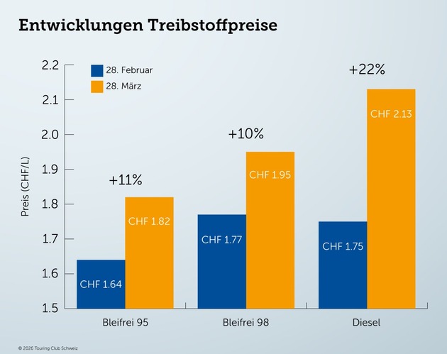 Der Iran-Krieg dauert mittlerweile über vier Wochen und in der Schweiz sind die Auswirkungen insbesondere an der Tankstelle zu spüren. Gerade im Hinblick auf die kommenden Osterfeiertage und die Frühlingsferien zieht es viele Schweizerinnen und Schweizer mit dem Auto in die Ferien. Für ihre Reise müssen sie mit deutlich höheren Treibstoffpreisen rechnen. Der TCS hat bereits zum zweiten Mal (Medienmitteilung vom 11. März) die Daten des TCS Benzinpreisradars ausgewertet.