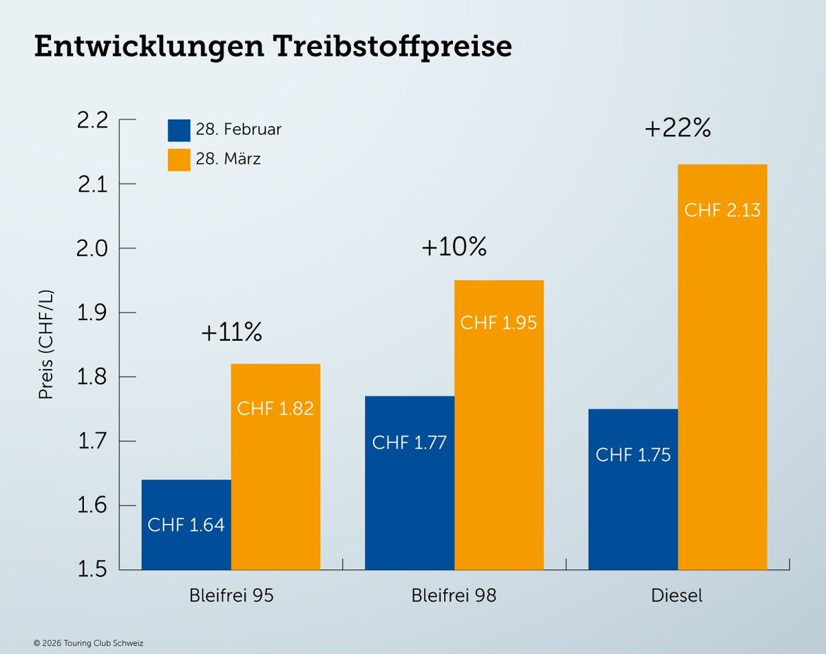 Wer mit dem Auto über Ostern in die Ferien fährt, muss an der Zapfsäule deutlich mehr bezahlen. Die Auswertung des TCS Benzinpreisradars zeigt, dass Benzin Bleifrei 95 in den letzten vier Wochen 11 Prozent teurer wurde. Beim Diesel beträgt der Preisanstieg sogar 22 Prozent.