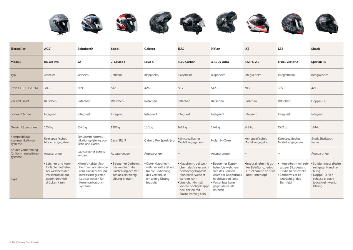 Der TCS hat neun auf dem Schweizer Markt erhältliche Motorradhelme verglichen, darunter Integral-, Klapp- und Jetmodelle. Die Analyse zeigt deutliche Unterschiede in Bezug auf Komfort, Handhabung, Ausstattung und Kompatibilität beim Tragen von Brillen. Der Integralhelm zeichnet sich durch seine rundum schützende Bauweise aus, der Klapphelm durch seine Vielseitigkeit, während der Jethelm durch sein geringes Gewicht und das Gefühl von Freiheit besticht.