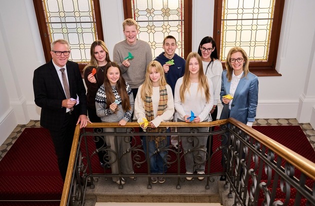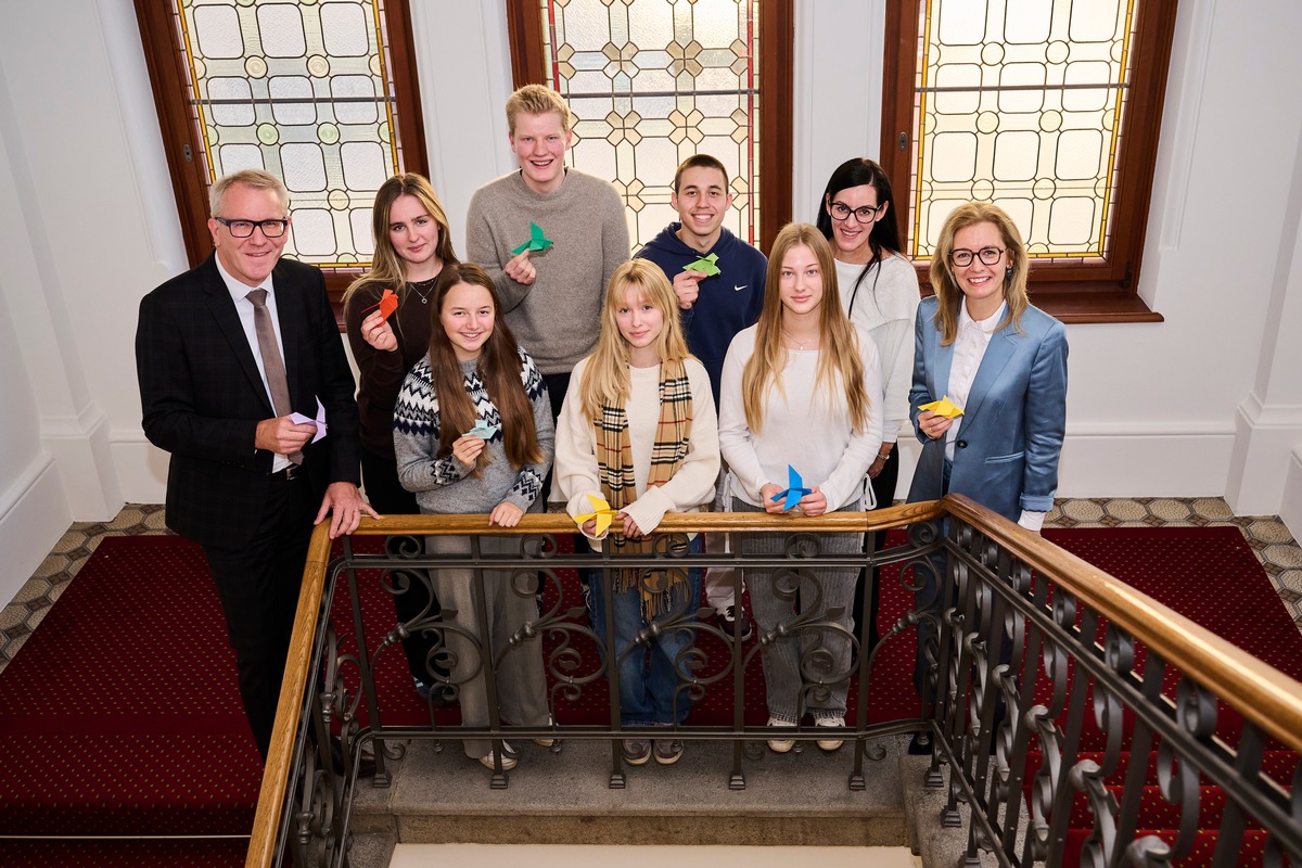 Ein besonderer Höhepunkt stellte die symbolische Übergabe der selbst gefalteten Friedenstauben am 10. November an Regierungschefin-Stellvertreterin, Sabine Monauni, und Bildungsminister, Daniel Oehry, dar. Die Schülerinnen und Schüler appellierten eindringlich an die Verantwortung der Politik, sich für den Schutz von Kindern in bewaffneten Konflikten einzusetzen. Die Regierungsmitglieder waren vom Engagement der Jugendlichen beindruckt. "Die Stimmen der Kinder erinnern uns daran, dass Frieden und Menschlichkeit keine abstrakten Werte sind, sondern konkrete Verpflichtungen. Ihr Engagement zeigt, wie wichtig es ist, Kinder ernst zu nehmen und ihnen eine Zukunft in Sicherheit und Würde zu ermöglichen", so Regierungschefin-Stellvertreterin, Sabine Monauni. Für Regierungsrat Daniel Oehry versinnbildlichte die Fragilität der kleinen Kunstwerke sehr treffend die Situation der Rechte der Kinder in den vielen Krisengebieten unserer Zeit.