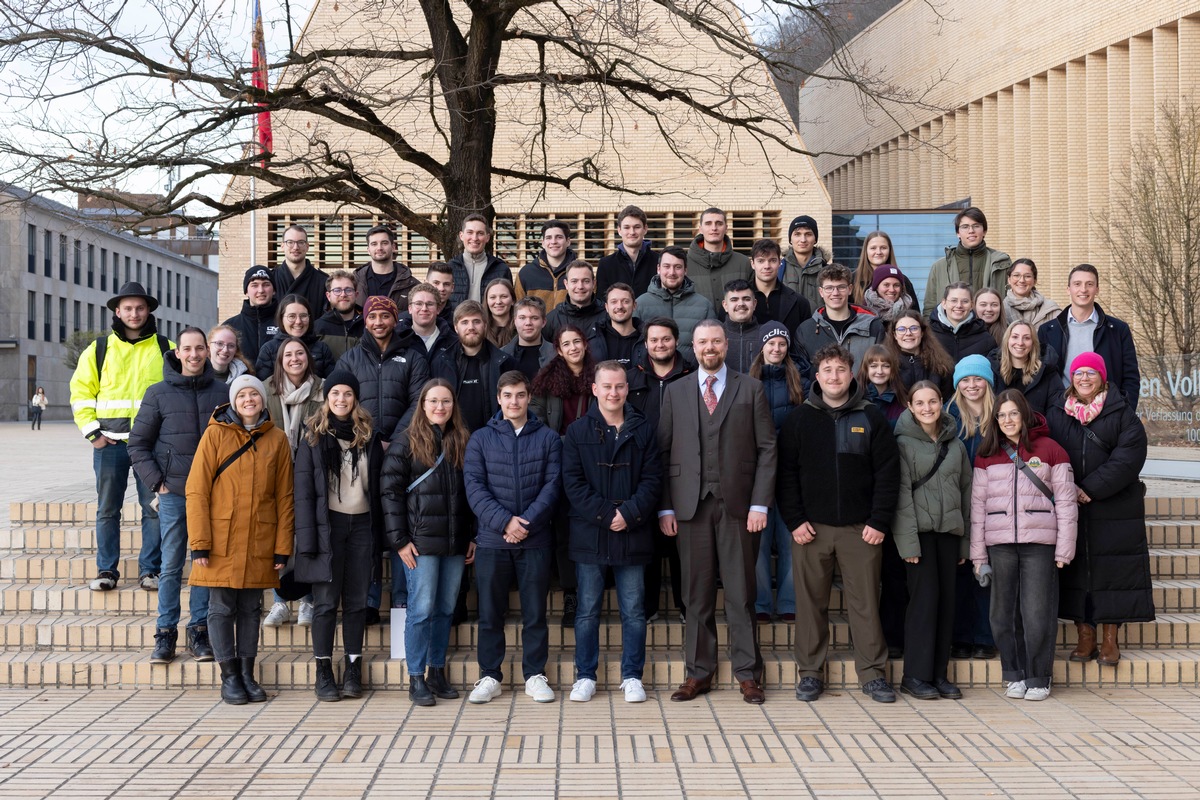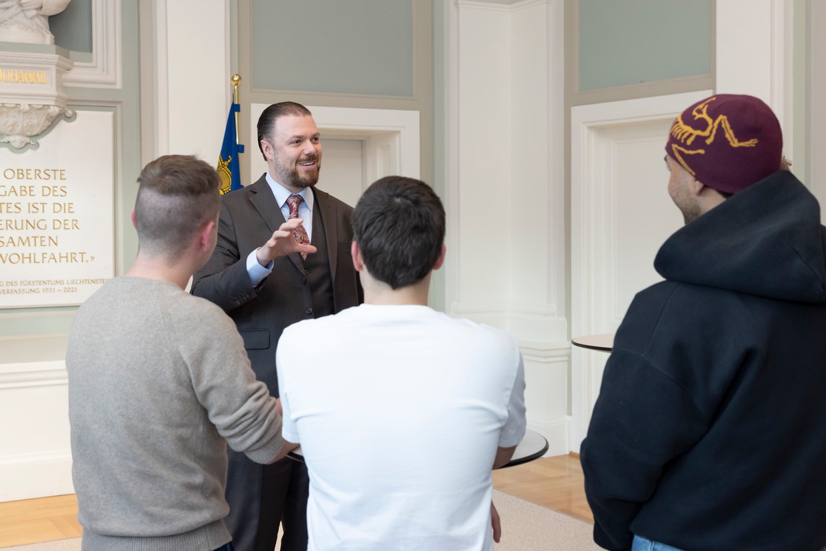 Gesellschaftsminister Emanuel Schädler ist am Montag, 22. Dezember 2025, mit Vertreterinnen und Vertretern des Jugendparlaments Dietmannsried sowie weiteren interessierten Jugendlichen aus der bayerischen Gemeinde zusammengekommen. Im Rahmen eines Gesprächs im Fürst Johannes Saal bot sich den rund 40 Gästen aus Deutschland die Gelegenheit, dem Regierungsmitglied Fragen zu verschiedenen Themen zu stellen - etwa zu seinen Aufgaben als Regierungsrat, seiner politischen Laufbahn, zur politischen Partizipation liechtensteinischer Jugendlicher oder zum politischen System Liechtensteins.