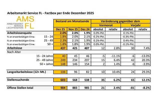 Beim Arbeitsmarkt Service Liechtenstein (AMS FL) waren Ende Dezember 437 Personen arbeitslos gemeldet. Die Arbeitslosenquote blieb im Dezember mit 2 % unverändert gegenüber dem Vormonat. Gegenüber dem Vorjahresmonat erhöhte sich die Arbeitslosenquote um 0,1 Prozentpunkte.