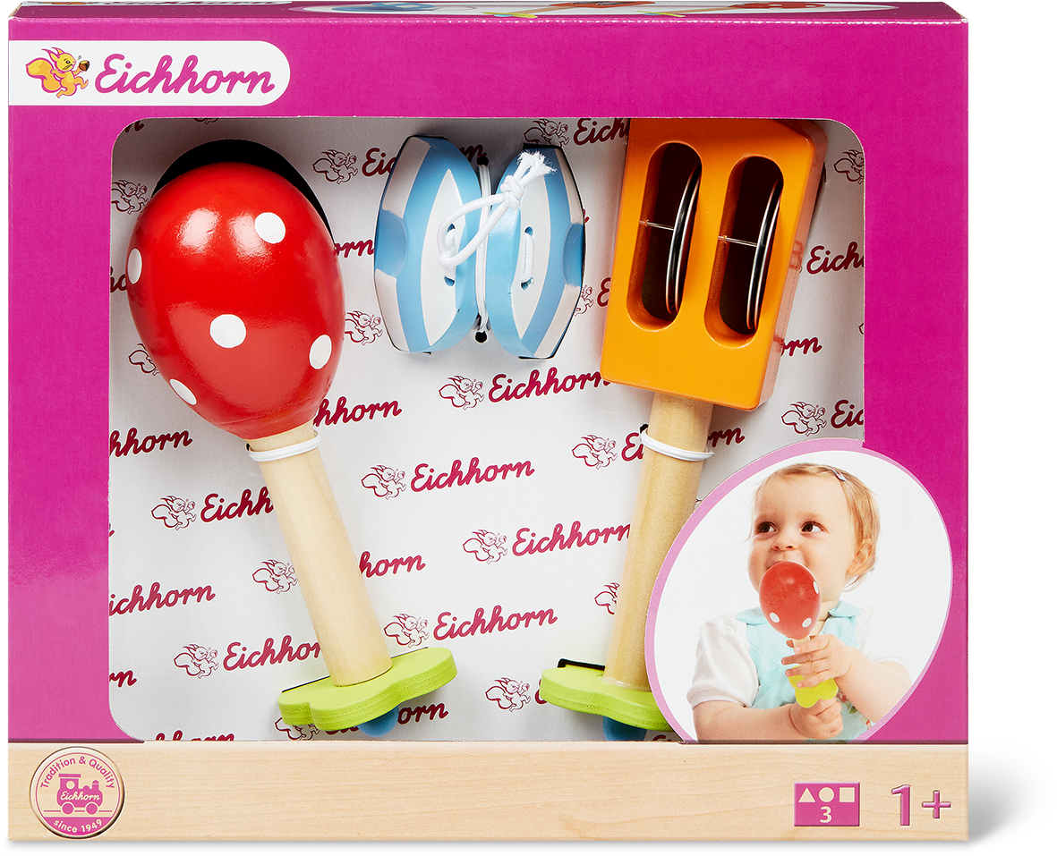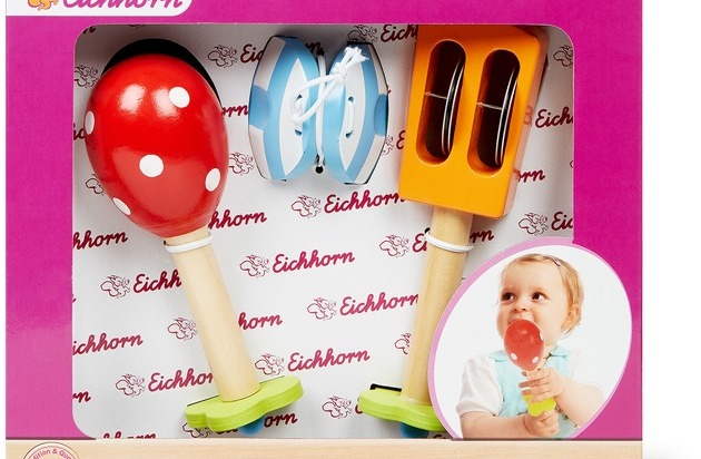 Das "Eichhorn Musikset" mit der Artikel-Nummer 7463.864 ist bei der Migros seit Februar 2017 im Verkauf. Wegen des Qualitätsmangels bei der orangen Holzrassel besteht eine Verletzungsgefahr. Es könnte vorkommen, dass die Kleinkinder sich durch den hervorstehenden Metallstift Hautschürfungen zuziehen.