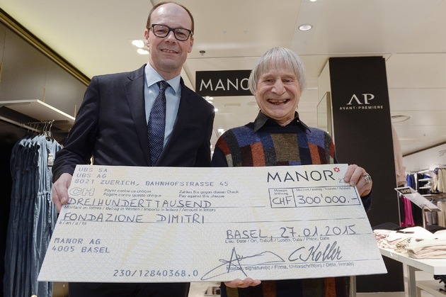 L'assegno con la somma raccolta è stato ufficialmente consegnato al celebre clown Dimitri da Bertrand Jungo, CEO di Manor, nel Grande Magazzino del marchio della Bahnhofstrasse di Zurigo. Con il motto «Regalate felicità due volte», Manor durante il periodo dell'Avvento ha messo in vendita delle carte regalo appositamente disegnate da Dimitri. Manor ha versato nel salvadanaio 1 franco per ogni carta, comprese le carte regalo che portavano altri motivi. Numerosi clienti hanno, d'altra parte, approfittato dell'occasione per fare un dono direttamente alle casse dei grandi magazzini. Ben 300 000 franchi sono stati così raccolti. Si tratta della maggiore somma messa assieme dal lancio dell'operazione caritativa di Natale di Manor.