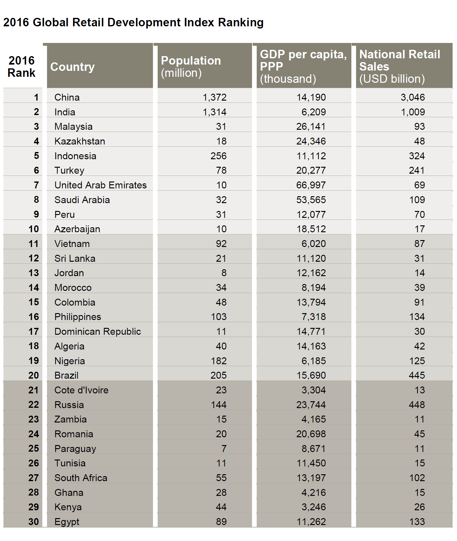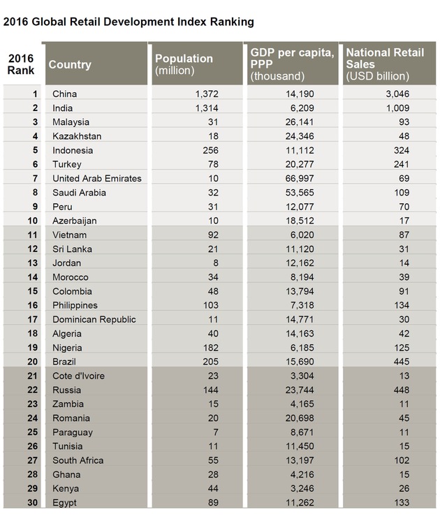 Auf den Plätzen 4 und 6 bis 10 des aktuellen GRDI folgen Kasachstan, die Türkei, die Vereinigten Arabischen Emirate, Saudia-Arabien, Peru und Aserbaidschan. Lateinamerikanische Länder wie Uruguay und Chile, 2015 noch auf den Rängen 2 und 3, sind diesmal gar nicht unter den Top 30 vertreten. Das Abschneiden von Russland (Platz 22) und Staaten des Mittleren Ostens ist von wirtschaftlichen Problemen und geopolitischer Instabilität belastet. Neu im Index ist Rumänien mit einer Platzierung als Nummer 24. Dabei profitiert das Land von einem stabilen Wirtschaftswachstum und Erfolgen in der Korruptionsbekämpfung. Die deutsche Discounterkette Lidl will ihr rumänisches Filialnetz in diesem Jahr ebenfalls weiter ausbauen und plant die Eröffnung von mindestens zehn zusätzlichen Standorten. Seit dem vergangenen Dezember ist Lidl rund 190 Geschäften in dem Land vertreten.