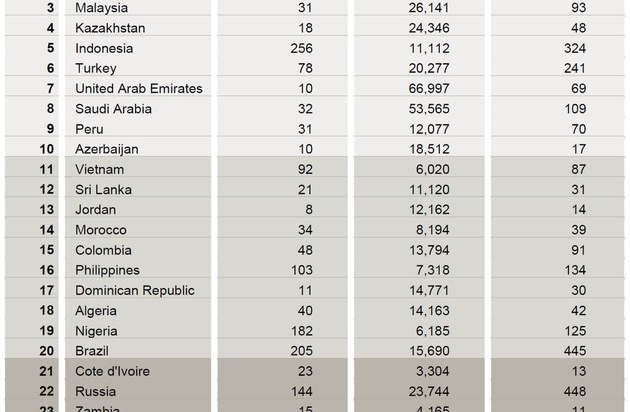 Verstärkt in den Fokus internationaler Retail-Konzerne gerückt sind dem aktuellen Ranking zufolge auch drei nordafrikanische Staaten, die ebenfalls unter den Top 30 gelistet sind, darunter Marokko (Platz 14), Algerien (Platz 18) und Ägypten (Platz 30). Insgesamt verzeichnen die Schwellenländer in den vergangenen 15 Jahren eine rasante Entwicklung: wuchs die Bevölkerung in den betrachteten Ländern um 21 Prozent (auf 6,2 Milliarden Menschen), stiegen die Handelsumsätze im gleichen Zeitraum um sagenhafte 350 Prozent. Damit geht mittlerweile mehr als die Hälfte der weltweiten Handelsumsätze auf das Konto dieser Märkte.