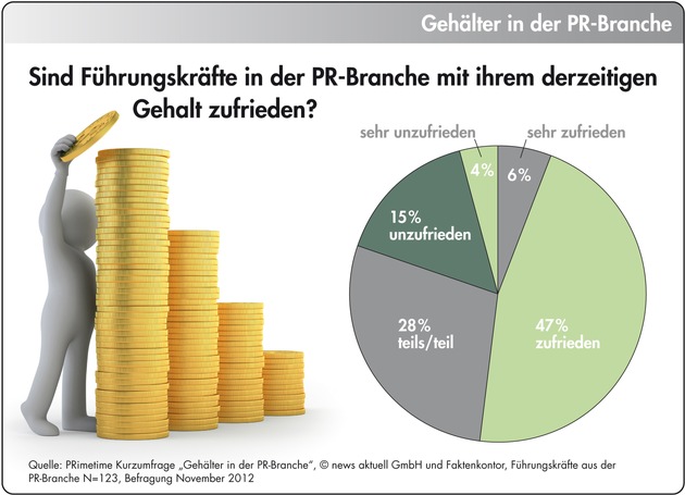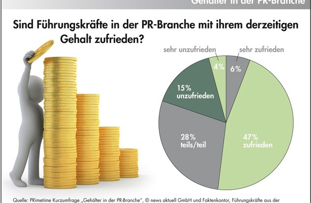 Große Teile der Führungskräfte in der deutschen PR-Branche zeigen sich in einer Umfrage unzufrieden mit ihrem Verdienst. Häufigster Grund ist unangemessenes Gehalt gemäß Ausbildung und Erfahrung des Entscheiders. Das ergab eine Umfrage in PRimetime, einer Initiative der dpa-Tochter news aktuell und Faktenkontor. PRimetime ist eine neue Community zum Austausch für Führungskräfte und Entscheider aus der PR-Branche.