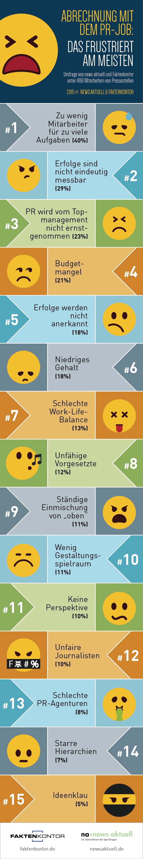 Die Umfrageergebnisse im Detail: 1. Zu wenig Mitarbeiter für zu viele Aufgaben (40 Prozent) 2. Erfolge sind nicht eindeutig messbar (29 Prozent) 3. PR wird vom Top-Management nicht ernstgenommen (23 Prozent) 4. Budgetmangel (21 Prozent) 5. Erfolge werden nicht anerkannt (18 Prozent) 6. Niedriges Gehalt (18 Prozent) 7. Schlechte Work-Life-Balance (13 Prozent) 8. Unfähige Vorgesetzte (12 Prozent) 9. Ständige Einmischung von "oben" (11 Prozent) 10. Wenig Gestaltungsspielraum (11 Prozent) 11. Keine Perspektive (10 Prozent) 12. Unfaire Journalisten (10 Prozent) 13. Schlechte PR-Agenturen (8 Prozent) 14. Starre Hierarchien (7 Prozent) 15. Ideenklau (5 Prozent) Quelle: Social Media Trendmonitor 2015