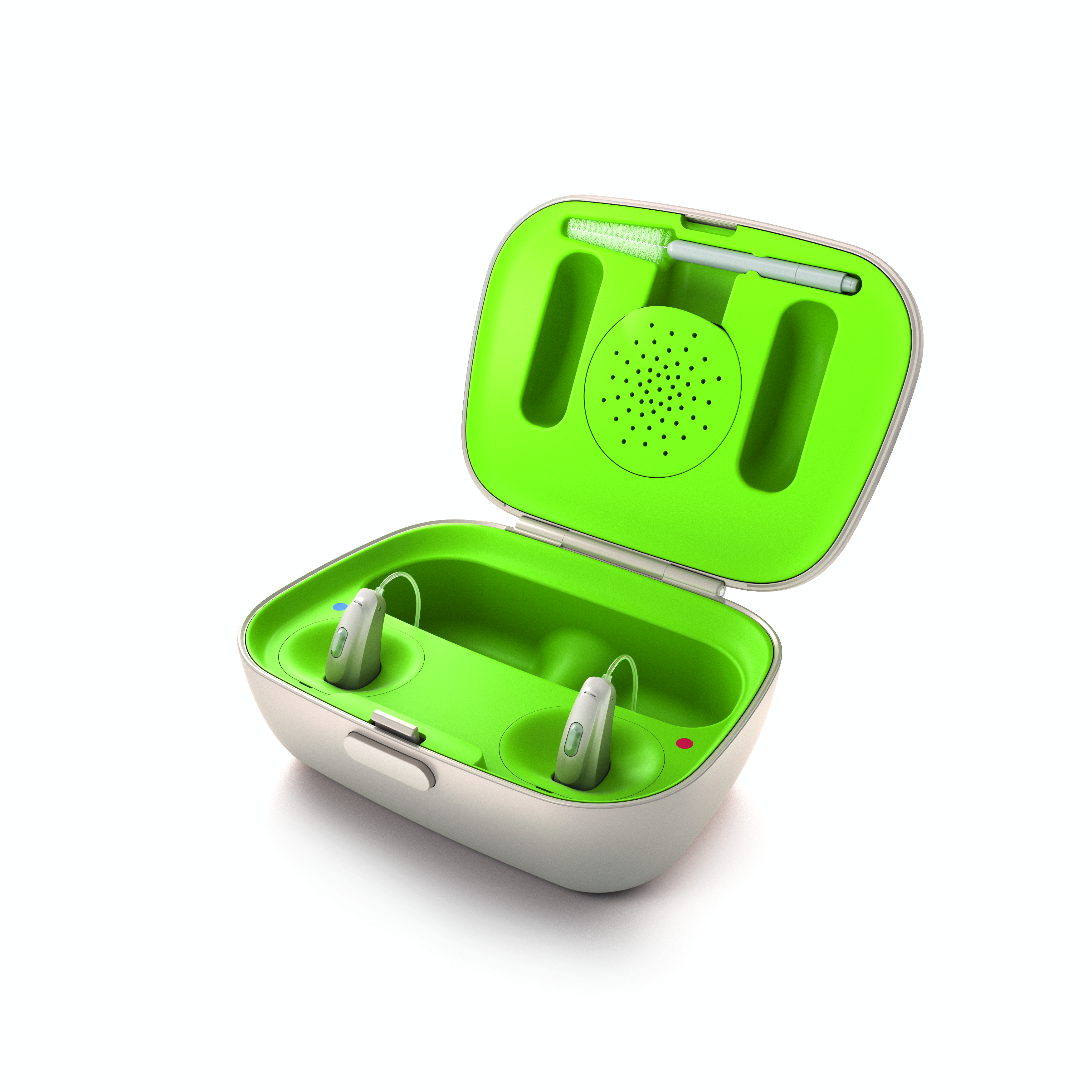 Audéo B-R hat die Jury des renommierten Design-Preises ausserdem mit einer intelligenten Aufladelösung überzeugt. Der Zusatzakku, welcher sich problemlos an das Phonak Ladegerät anschliessen lässt, reicht mit seiner Kapazität aus, um zwei Hörgeräte siebenmal vollzuladen - ideal für Kurztrips, bei denen keine Stromquelle verfügbar ist. Darüber hinaus bietet Phonak ein kompaktes Mini-Ladegerät für vollständige Flexibilität.