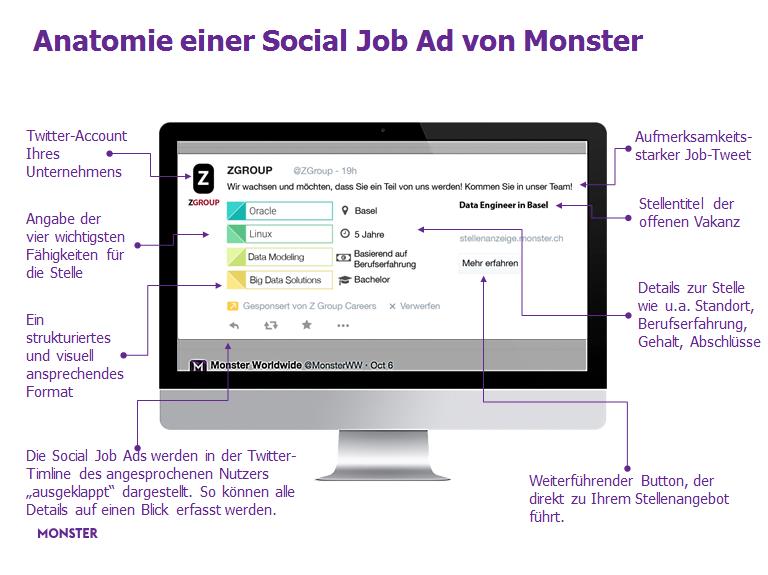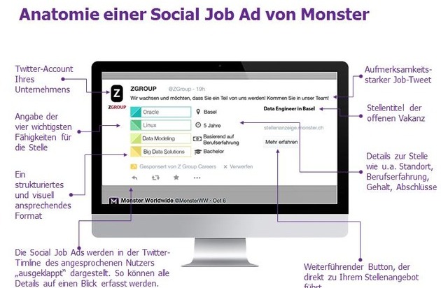 Zukünftig können Stellenanzeigen automatisch und zeitnah zur Schaltung auf monster.ch in den Timelines von Twitter-Nutzern angezeigt werden, deren berufliches Profil zu dem des gesuchten Kandidaten passt. Die Monster Social Job Ads unterstützen Unternehmen dabei, ihren nächsten Mitarbeiter mit Hilfe von sozialen Netzwerken zu finden. Basis ist ein optimiertes Targeting (Zielgruppendefinition), das im Rahmen des so genannten Social Recruitings bisher eine der grössten Herausforderungen für innovative Recruiter darstellte. Alles was sie für die Schaltung der Social Job Ads benötigen, ist die reguläre Stellenanzeige für ihr Unternehmen auf monster.ch und einen Twitter-Account.