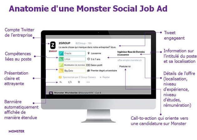 Avec les Monster Social Job Ads, Monster aide les responsables des Ressources Humaines à trouver des candidat(e)s potentiel(le)s sur Twitter et à les contacter en les ciblant via Tweet.