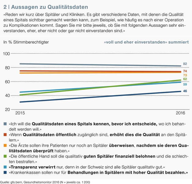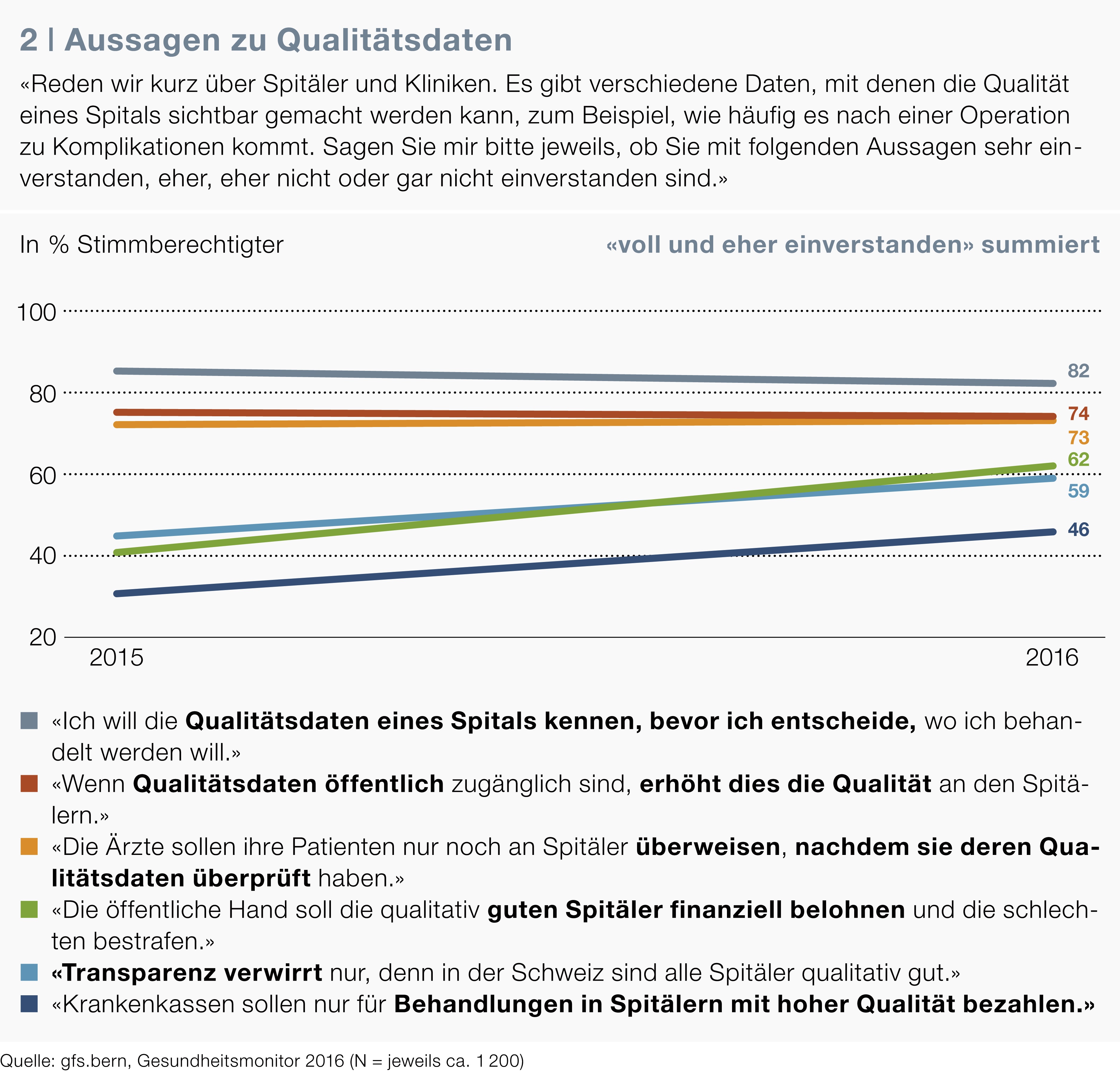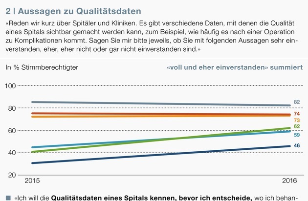 82% der Befragten möchten die Qualitätsdaten kennen, bevor sie sich für die Behandlung in einem Spital oder einer Klinik entscheiden, und 75% meinen, öffentlich zugängliche Qualitätsdaten würden die Qualität der Behandlung in den Spitälern erhöhen. Zudem ist erstmals eine Mehrheit von 62% (+21 Prozentpunkte) der Meinung, die öffentliche Hand solle qualitativ gute Spitäler finanziell belohnen respektive die schlechten bestrafen. Dies ist die grösste Veränderung zur Befragung im Vorjahr überhaupt. Allerdings besteht auch eine gewisse Ambivalenz in der Frage, denn immerhin 59% befürchten, dass mehr Transparenz eher verwirren könnte, da bei uns alle Spitäler qualitativ gut seien. Nicht mehrheitsfähig ist zurzeit die Meinung, dass die Krankenkassen nur die Behandlung in Spitälern mit hoher Qualität bezahlten sollten. 46% (immerhin 15 Prozentpunkte mehr als vor einem Jahr) stimmen dem zu, während 50% keine solche strikte Qualitätsauflage möchten.