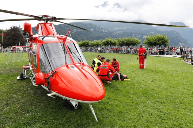 Über dem See brauen sich dunkle Wolken zusammen. Mit stürmischen Böen und heftigen Wellen kündigt sich ein schweres Gewitter an. Die Bedingungen für die Teilnehmer der Segelregatta werden kritisch, sie kämpfen mit den Naturelementen. Plötzlich sind mehrere Boote in einen Unfall verwickelt, bei dem Crewmitglieder ins Wasser geschleudert und verletzt werden. Eine Tragödie scheint unausweichlich... Dieses Szenario bildete den Ausgangspunkt der Vorführungen der Rotkreuz-Rettungsorganisationen, die dem Publikum auf dem Auslandschweizerplatz in Brunnen dargeboten wurden. Sie demonstrierten in einer 30-minütigen Vorführung gemeinsam ihre spezialisierten Einsatzkompetenzen zu Land, zu Wasser und in der Luft. Rettungsschwimmer der Schweizerischen Lebensrettungs-Gesellschaft stürzten sich ins Wasser und retteten die Verunfallten an Land. Hier warteten bereits Angehörige der Samariter und des Schweizerischen Militär-Sanitäts-Verbands, um Erste Hilfe zu leisten. Während dem die Helferinnen und Helfer unter den aufmerksamen Augen des Publikums lebensrettende Sofortmassnahmen durchführten, Wunden versorgten und erste Verbände anlegten, erklärte eine Sprecherin Zusammenhänge der Vorführung und worauf es bei der Hilfe besonders ankommt. Für den Weitertransport der Patienten ins Spital warteten dann bereits eine Ambulanz des Rotkreuzdienstes und ein Helikopter der Rega. Die Übergabe der erstversorgten Patienten in die beiden Transportmittel war zugleich der Abschluss der Rettungsvorführung. Die Helferinnen und Helfer, die als Retter oder Patienten im Einsatz gestanden sind, waren mehrheitlich Freiwillige lokaler Rotkreuz-Rettungsorganisationen. Der Helikopter mit der Besatzung wurde von der nahe gelegenen Rega-Basis in Erstfeld gestellt.