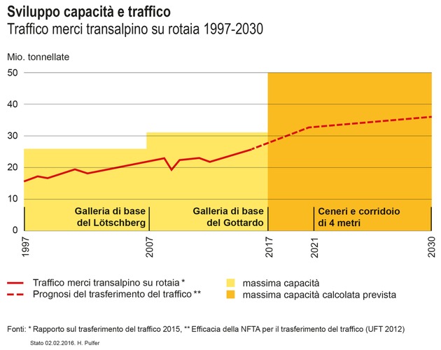 Con la costruzione della Alptransit e del corridoio di 4 metri tra Basilea e Chiasso la capacità delle tracce per i treni merci aumenta di un ulteriore 30 percento (dalle attuali 300 passeranno a 390 al giorno). «Inoltre grazie al tunnel di base possono circolare treni più lunghi e più pesanti», ha spiegato l'esperto di pianificazione ferroviaria internazionale Heinz Pulfer durante la conferenza stampa a Berna. In uno studio egli giunge alla conclusione che grazie alla Alptransit sarà possibile trasportare attraverso le Alpi circa 50 milioni di tonnellate di merci all'anno. Oggi strada e rotaia riescono a raggiungere complessivamente 38,5 milioni di tonnellate.