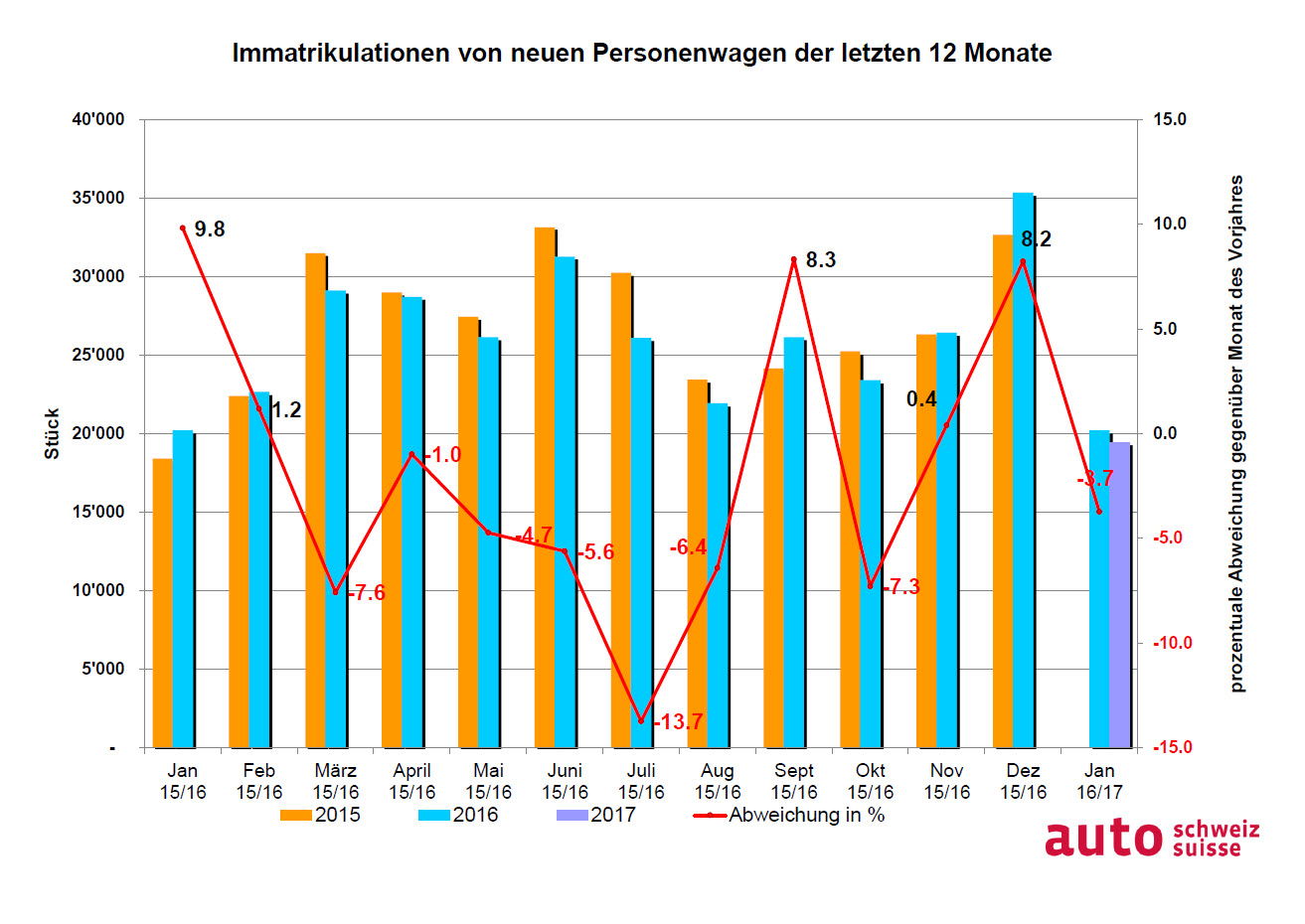 Im Januar sind in der Schweiz und im Fürstentum Liechtenstein 19'451 neue Personenwagen immatrikuliert worden. Verglichen mit dem Vorjahresmonat, der noch von Sondereffekten des Frankenschocks profitieren konnte, resultiert ein geringfügiger Rückgang von 3,7 Prozent oder 754 Fahrzeugen. Passend zum Wintereinbruch kratzte der Allrad-Anteil im vergangenen Monat an der 50-Prozent-Marke. Das kalte Wetter hielt aber wohl auch viele Auto-Interessierte aus den Ausstellungsräumen der Markenhändler fern.