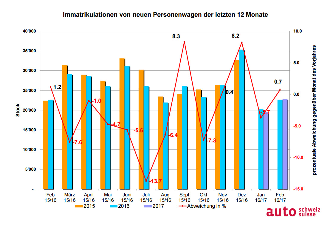 Nach zwei Monaten im Jahr 2017 stehen 42'260 neue Personenwagen zu Buche. Unter Berücksichtigung des Schaltjahr-Effektes ist der Rückstand von 598 Immatrikulationen oder 1,4 Prozent auf den vergleichbaren Vorjahreszeitraum quasi vernachlässigbar. Denn an einem durchschnittlichen Arbeitstag werden in der Schweiz und im Fürstentum Liechtenstein rund 1'200 neue Personenwagen eingelöst. Im Verlauf der kommenden Monate sollte sich das Markt-Volumen daher demjenigen von 2016 angleichen, was sogar die Erwartungen der auto-schweiz-Mitglieder übertreffen würde.