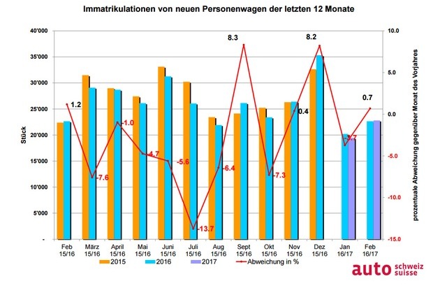Der Markt für neue Personenwagen in der Schweiz und im Fürstentum Liechtenstein hat im Februar leicht zugelegt. Bei 22'809 Neuimmatrikulation resultiert ein Zuwachs von 0,7 Prozent oder 156 Fahrzeugen im Vergleich zum Vorjahresmonat. In Anbetracht des vergangenen Schaltjahres, als der Februar 2016 einen Werktag mehr hatte, stellt dies ein äusserst erfreuliches Ergebnis dar. Fast jeder zweite im Februar eingelöste Neuwagen verfügt über Allrad, der Diesel hält seinen hohen Marktanteil von fast 40 Prozent - aller Unkenrufe zum Trotz.