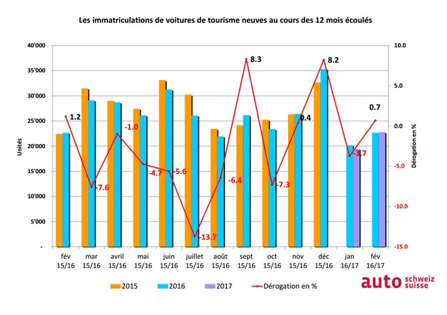 Au cours des deux premiers mois de 2017, on a vendu 42 260 voitures de tourisme neuves. Compte tenu de l'effet de l'année bissextile, le recul de 598 immatriculations ou de 1,4 % en comparaison avec la même période de l'année précédente est presque négligeable. Car en Suisse et dans la principauté du Liechtenstein, environ 1200 autos neuves sont mises en circulation chaque jour ouvrable. Au cours des mois à venir, le volume du marché se rapprochera donc probablement à celui de 2016, ce qui dépasserait même les attentes des membres d'auto-suisse.