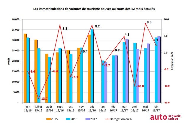 Le marché des voitures de tourisme neuves en Suisse et dans la principauté du Liechtenstein a connu une expansion de 2,1 % en juin. Les 31 923 voitures neuves correspondent à une hausse de 664 immatriculations par rapport au même mois de l'année précédente. Les chiffres cumulés pour les premiers six mois de l'année sont également supérieurs à ceux de l'année dernière (0,6 %, 881 véhicules). La branche automobile suisse peut dès lors se retourner sur un très bon premier semestre.
