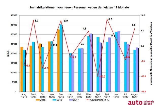 Der Sommer hat für den Markt für neue Personenwagen in der Schweiz und im Fürstentum Liechtenstein ein positives Ende genommen. Mit 23'160 Immatrikulationen resultiert das drittbeste August-Ergebnis seit der Jahrtausendwende und ein Plus zum Vorjahresmonat von 5,6 Prozent oder 1'233 Fahrzeugen. Damit liegt der Auto-Markt 2017 nach acht Monaten wieder leicht im grünen Bereich. Gleichzeitig läutet der heutige Tag mit der Einführung des Testzyklus WLTP ein neues Zeitalter in der Automobilbranche ein.