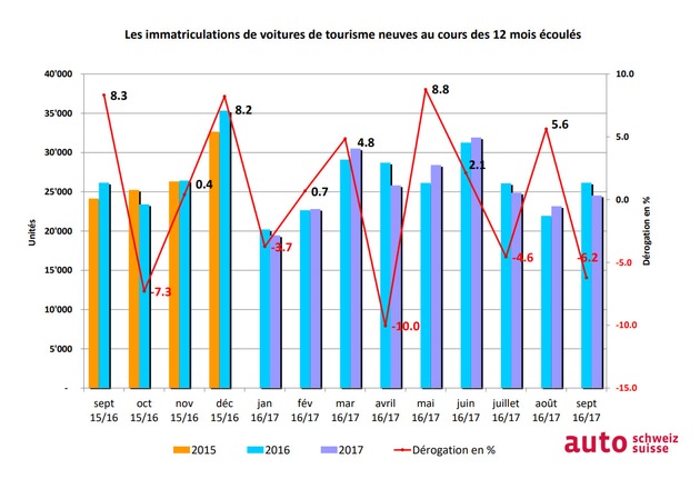 En raison du léger recul en septembre, le marché global a connu une baisse minimale. Avec 231 483 immatriculations au cours des trois premiers trimestres de l'année courante, on est resté en deçà de 300 unités ou de 0,3 % seulement du résultat d'il y a une année. Cela pourrait toutefois changer en octobre déjà, vu que pendant les derniers mois les hausses et les baisses des chiffres annuels cumulés ne cessaient de s'alterner.