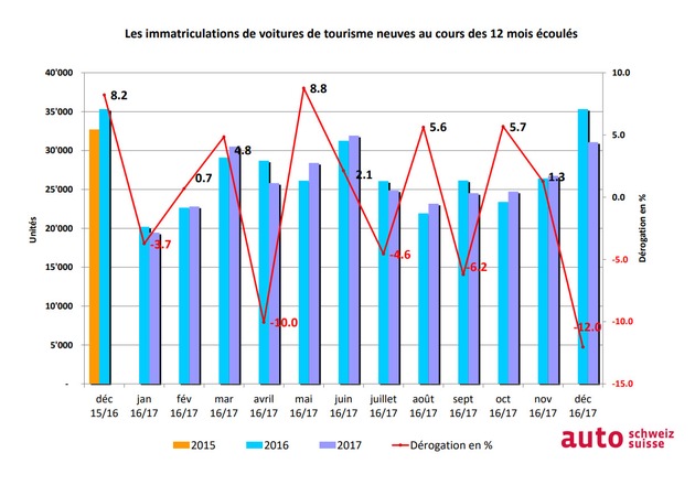 Les attentes pour l'année automobile 2017 ont largement été remplies. Seules 3290 voitures de tourisme manquaient pour répéter le résultat de l'année dernière. Cela résulte entre autres du mois de décembre écoulé, où le nombre record de 35 000 immatriculations en 2016 n'a pas pu être égalisé. Cependant, 31 072 mises en circulation en font le quatrième meilleur mois de décembre depuis le nouveau millénaire ainsi que le deuxième mois de 2017 le plus fort après juin. Avec une impressionnante part de voitures de tourisme quatre roues motrices de 53,2 %, le mois dernier a en outre réussi à enregistrer un autre niveau record : pour la première fois de leur histoire, les 4x4 vendues sur l'ensemble d'un mois étaient plus nombreux que les voitures sans transmission intégrale.