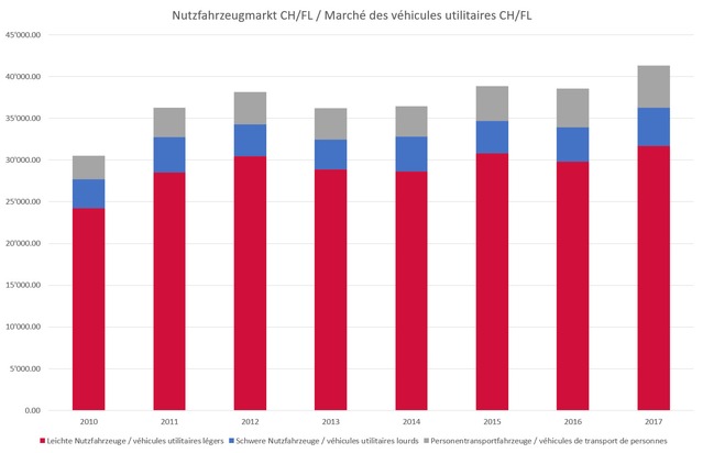 Le marché des véhicules utilitaires en Suisse et dans la principauté du Liechtenstein a connu sa meilleure année de la décennie en cours. En 2017, 31 683 véhicules utilitaires légers et 4586 véhicules utilitaires lourds ainsi que 5053 véhicules de transport de personnes ont été immatriculés pour la première fois. Chacun des trois segments a enregistré une hausse sensible par rapport à l'année précédente: véhicules utilitaires légers 6,2%, utilitaires lourds 12,5 % et véhicules de transport de personnes 8,6 %. Le redressement conjoncturel actuel pourrait également donner un nouvel élan au marché en 2018.