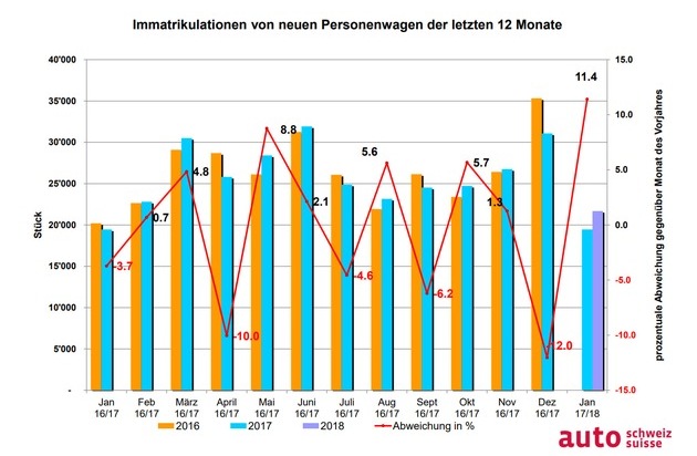 Ein Jahresauftakt nach Mass für den Schweizer Auto-Markt: Exakt 21'671 neue Personenwagen sind im Januar in der Schweiz und in Liechtenstein eingelöst worden, 2'220 oder 11,4 Prozent mehr als im Vorjahresmonat. Damit ist der beste Jahresstart seit 2012 gelungen. Erstmals im Januar liegt der Allrad-Anteil über 50 Prozent - dieser Trend könnte sich durch das Jahr 2018 ziehen.